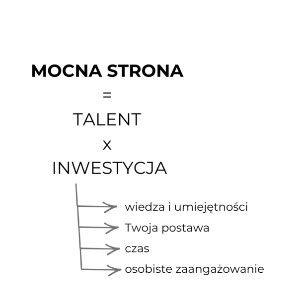 Według Gallupa talent staje się mocną stroną dopiero wtedy, gdy w niego zainwestujesz czyli połączysz go z wiedzą, umiejętnościami i regularną praktyką. Dopiero ta inwestycja sprawia, że zaczynasz generować wartość dla siebie i innych w sposób niemal doskonały.